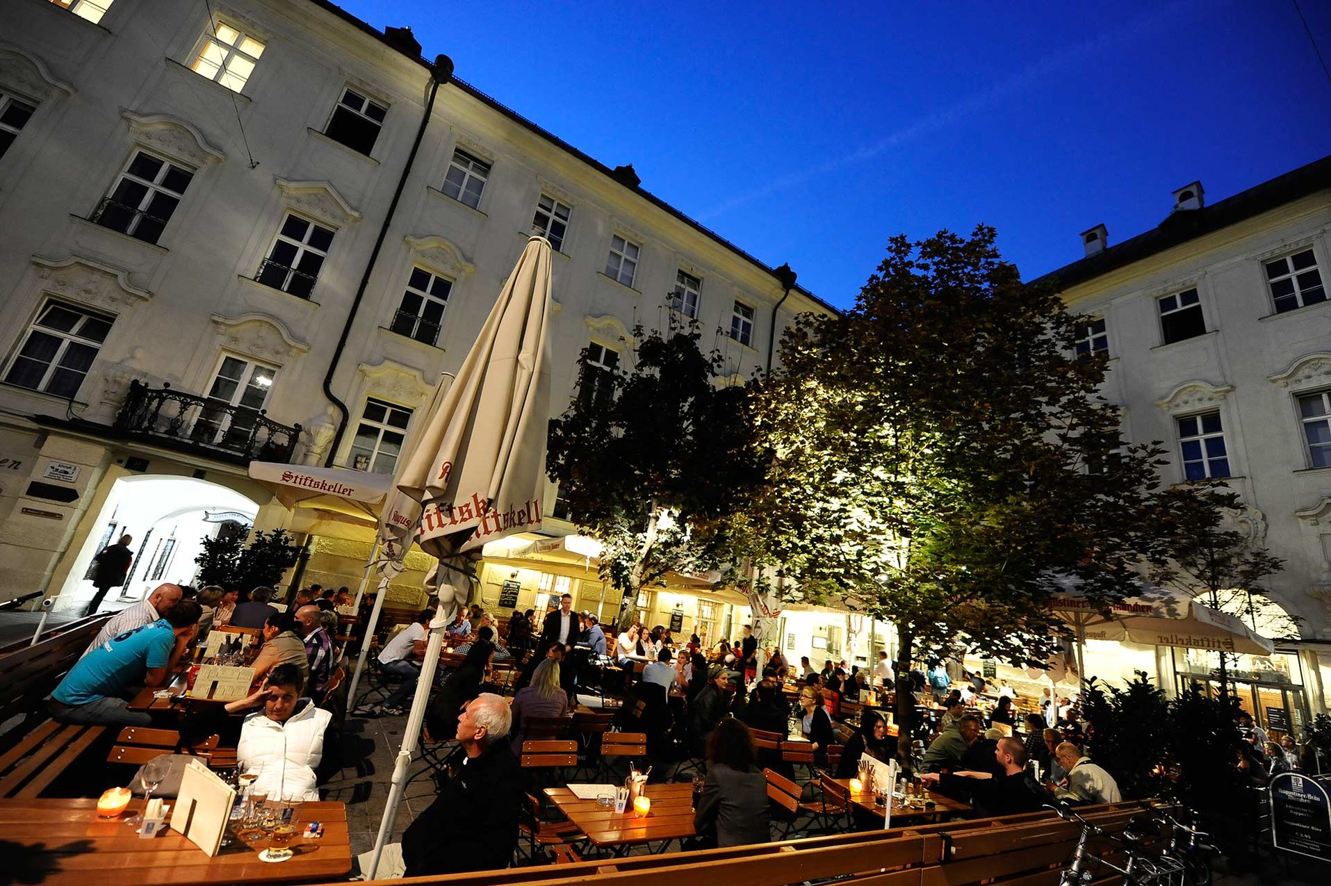 Proprio in piazza Franziskaner Platz si trova il nostro spazioso giardino. Con circa 250 posti a sedere è il giardino estivo più grande di Innsbruck e un incontro popolare per tutti.