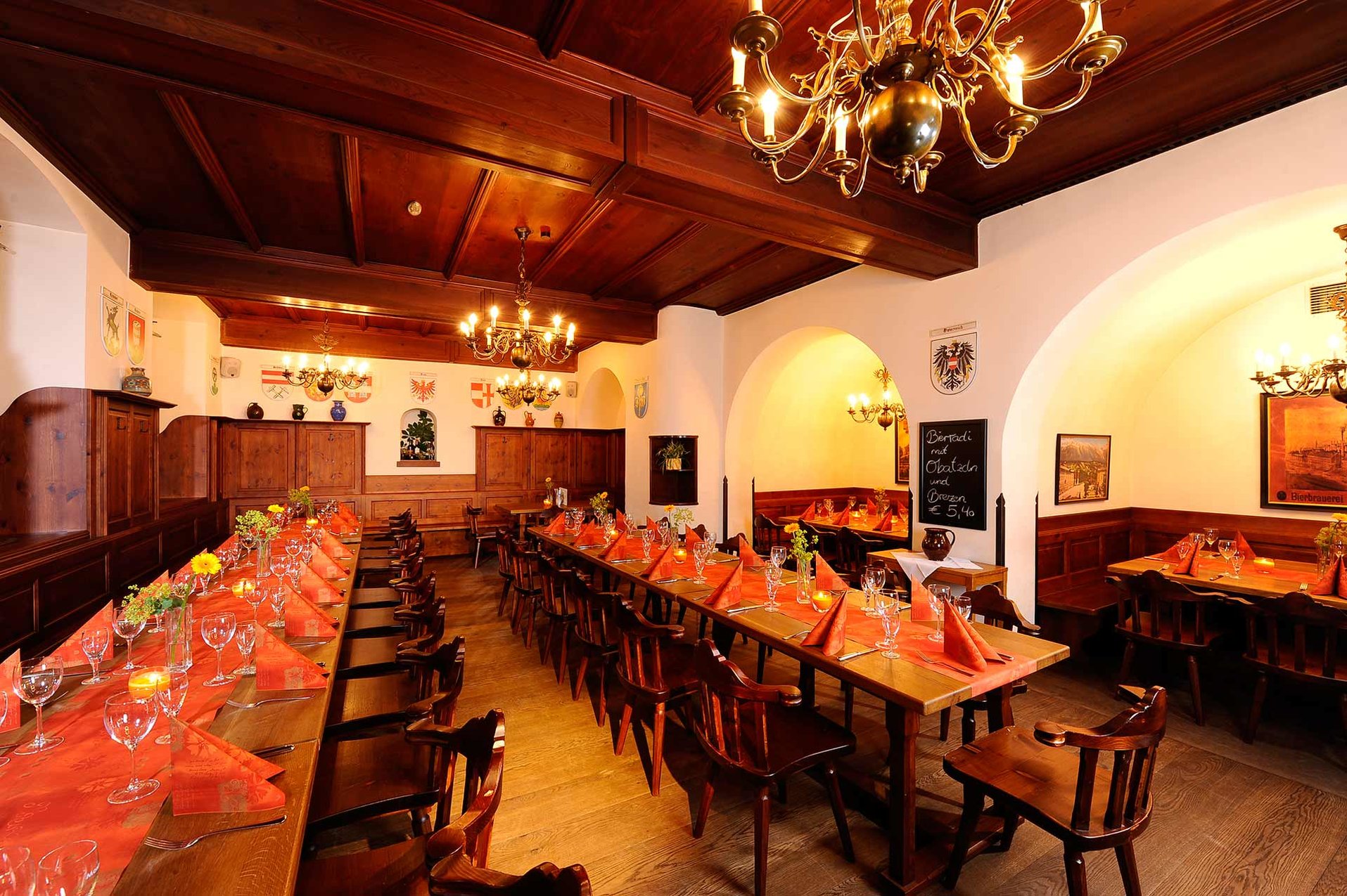 La cantina storica a volta accoglie la cantina birraria, come zona fumatori, con il tipico carattere da birreria. Appropriatamente serviamo delizie tirolesi e naturalmente gli ottimi prodotti del birrificio Augustiner.