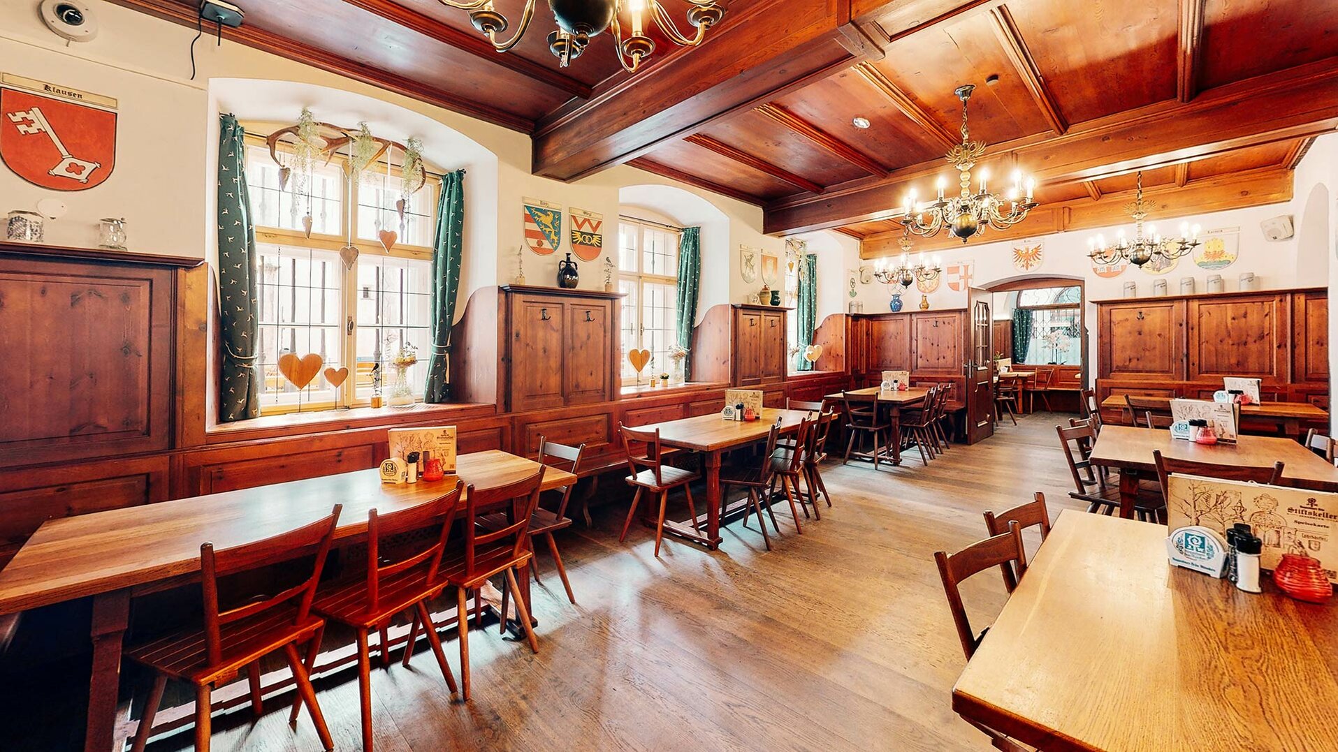 Die original getäfelte Wappenstube ist barrierefrei erreichbar. Das traditionell-rustikale Ambiente bildet den passenden Rahmen für ein Beisammensein unter Freunden oder ein gemütliches Geschäftsessen.